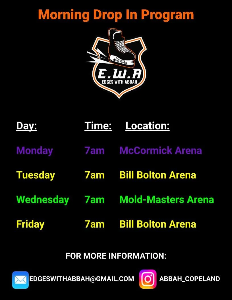 As this is a drop-in program, all skaters are welcome as long as they can get up and down the ice independently. The cost is $35/skater (HST included) per lesson. Payments are made via e-transfer to edgeswithabbah@gmail.com the night prior to each drop-in class (before 10pm).